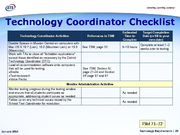 Technology Coordinator Checklist Technology Coordinator Activities Disable Spaces in Mission Control on computers with Mac OS X 10. 7 (Lion), 10. 8 (Mountain Lion), or 10. 9 (Mavericks). Work with TAs to close all “forbidden applications” except those identified as necessary by the District Technology Coordinator (DTC). Load all accommodation software onto computers that will be used for testing. Braille Test-to-speech Voice Packs References in TSM See TSM, page 33 Estimated Time to Complete Target Completion Date (or fill in your own date) 5– 10 hours Complete at least 1– 2 weeks prior to testing. See TSM, Section IV, page 21 -24 and Section VII page 57 and 67 Monitor Administration Activities Monitor testing progress during the testing window and ensure that all students participate as appropriate, addressing student issues as needed. Follow up on any technical issues raised by the School Test Coordinator for resolution. As needed TSM 71– 72 January 2014 Technology Requirements | 29