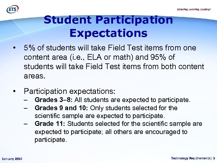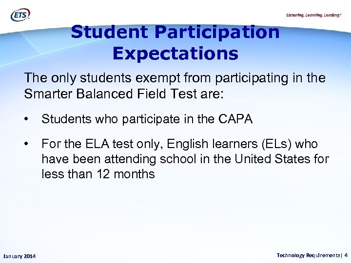 Student Participation Expectations • 5% of students will take Field Test items from one content area (i. e. , ELA or math) and 95% of students will take Field Test items from both content areas. • Participation expectations: – – – January 2014 Grades 3– 8: All students are expected to participate. Grades 9 and 10: Only students selected for the scientific sample are expected to participate. Grade 11: Students selected for the scientific sample are expected to participate; all others are encouraged to participate. Technology Requirements| 3