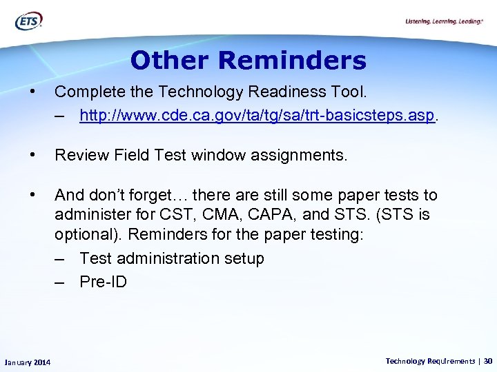Other Reminders • Complete the Technology Readiness Tool. – http: //www. cde. ca. gov/ta/tg/sa/trt-basicsteps. asp. • Review Field Test window assignments. • And don’t forget… there are still some paper tests to administer for CST, CMA, CAPA, and STS. (STS is optional). Reminders for the paper testing: – Test administration setup – Pre-ID January 2014 Technology Requirements | 30