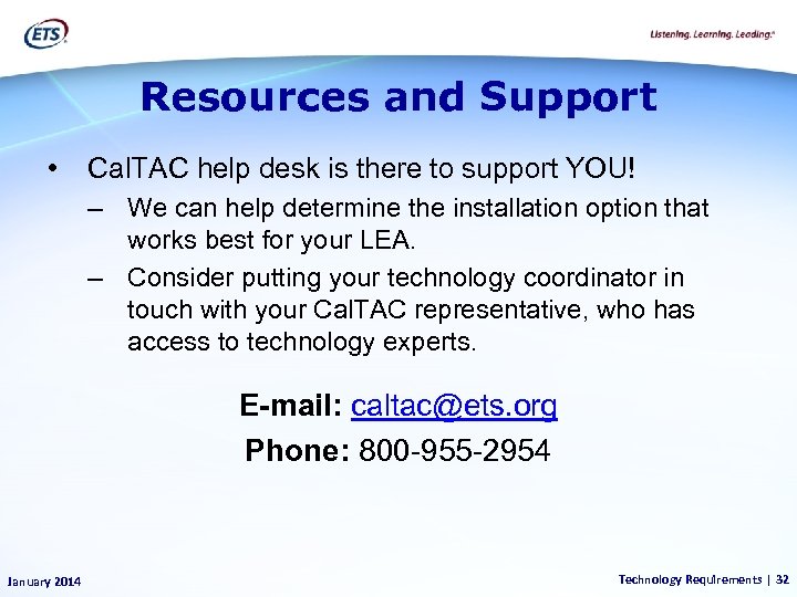 Resources and Support • Cal. TAC help desk is there to support YOU! – We can help determine the installation option that works best for your LEA. – Consider putting your technology coordinator in touch with your Cal. TAC representative, who has access to technology experts. E-mail: caltac@ets. org Phone: 800 -955 -2954 January 2014 Technology Requirements | 32