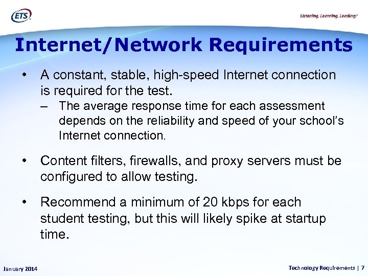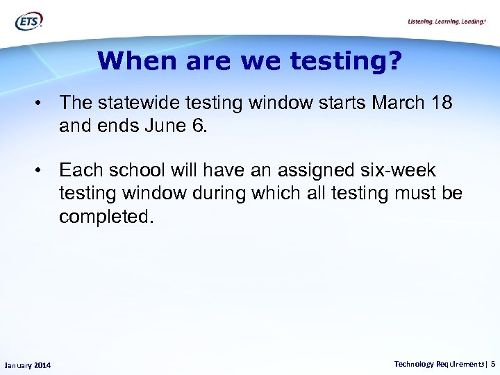 When are we testing? • The statewide testing window starts March 18 and ends June 6. • Each school will have an assigned six-week testing window during which all testing must be completed. January 2014 Technology Requirements| 5