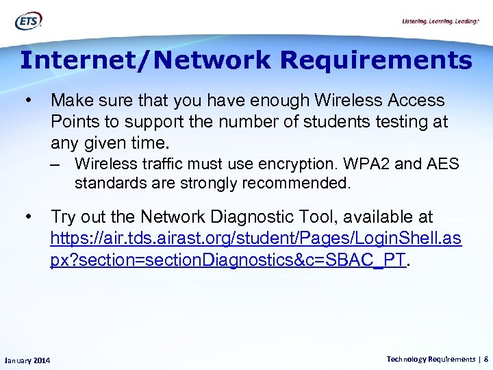 Internet/Network Requirements • Make sure that you have enough Wireless Access Points to support the number of students testing at any given time. – Wireless traffic must use encryption. WPA 2 and AES standards are strongly recommended. • January 2014 Try out the Network Diagnostic Tool, available at https: //air. tds. airast. org/student/Pages/Login. Shell. as px? section=section. Diagnostics&c=SBAC_PT. Technology Requirements | 8