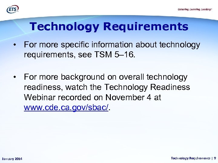 Technology Requirements • For more specific information about technology requirements, see TSM 5– 16. • For more background on overall technology readiness, watch the Technology Readiness Webinar recorded on November 4 at www. cde. ca. gov/sbac/. January 2014 Technology Requirements | 9