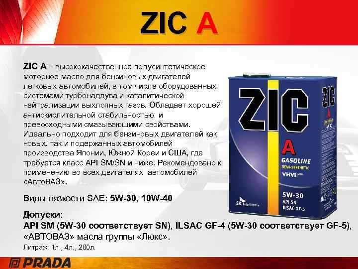 ZIC A + ZIC A+ – высококачественное полусинтетическое моторное масло с лучшими эксплуатационными характеристиками для бензиновых двигателей всех типов, в том числе оборудованных системами турбонаддува и инжекторной подачи топлива. Изготовлено на основе YUBASE с использованием технологии VHVI и сбалансированного пакета присадок от ведущих мировых производителей. Имеет пониженное содержание сульфатной золы, фосфора и серы (“Low SAPS”). Виды вязкости SAE: 5 W-30, 10 W-40 Допуски: API SM/CF (5 W-30 соответствует SN), ACEA A 3/B 3 -08, A 3/B 4 -08 C 3 -08, MB 229. 31, VW 502 00/505 00, «АВТОВАЗ» масла группы «Люкс» . Литраж: 1 л. , 6 л. , 4 л. , 200 л.