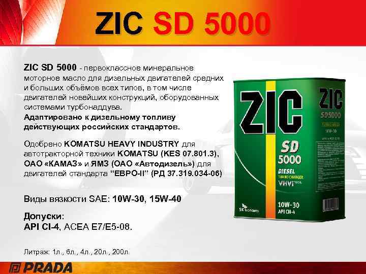 ZIC SD 5000 - первоклассное минеральное моторное масло для дизельных двигателей средних и больших объёмов всех типов, в том числе двигателей новейших конструкций, оборудованных системами турбонаддува. Адаптировано к дизельному топливу действующих российских стандартов. Одобрено KOMATSU HEAVY INDUSTRY для автотракторной техники KOMATSU (KES 07. 801. 3), ОАО «КАМАЗ» и ЯМЗ (ОАО «Автодизель» ) для двигателей стандарта “ЕВРО-II” (РД 37. 319. 034 -06) Виды вязкости SAE: 10 W-30, 15 W-40 Допуски: API CI-4, ACEA E 7/E 5 -08. Литраж: 1 л. , 6 л. , 4 л. , 200 л.