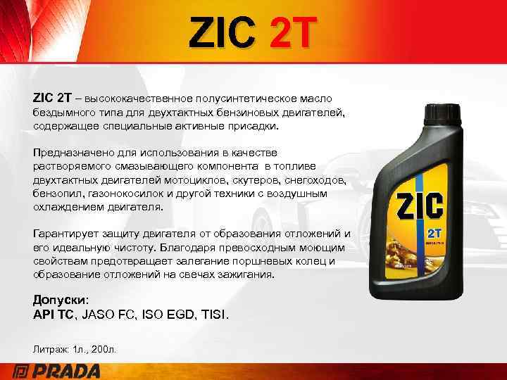 ZIC 2 T – высококачественное полусинтетическое масло бездымного типа для двухтактных бензиновых двигателей, содержащее специальные активные присадки. Предназначено для использования в качестве растворяемого смазывающего компонента в топливе двухтактных двигателей мотоциклов, скутеров, снегоходов, бензопил, газонокосилок и другой техники с воздушным охлаждением двигателя. Гарантирует защиту двигателя от образования отложений и его идеальную чистоту. Благодаря превосходным моющим свойствам предотвращает залегание поршневых колец и образование отложений на свечах зажигания. Допуски: API TC, JASO FC, ISO EGD, TISI. Литраж: 1 л. , 200 л.