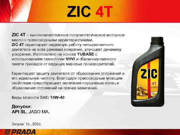 ZIC 4 T – высококачественное полусинтетическое моторное масло с превосходными характеристиками. ZIC 4 T гарантирует надежную работу четырехтактного двигателя на всех режимах вождения, улучшает динамику ускорения. Изготовлено на основе YUBASE с использованием технологии VHVI и сбалансированного пакета присадок от ведущих мировых производителей. Гарантирует защиту двигателя от образования отложений и его идеальную чистоту. Благодаря превосходным моющим свойствам предотвращает залегание поршневых колец и образование отложений на свечах зажигания. Виды вязкости SAE: 10 W-40 Допуски: API SL, JASO MA. Литраж: 1 л. , 200 л.