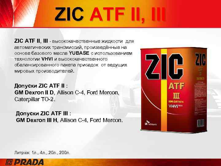 ZIC ATF II, III - высококачественные жидкости для автоматических трансмиссий, произведённые на основе базового масла YUBASE с использованием технологии VHVI и высококачественного сбалансированного пакета присадок от ведущих мировых производителей. Допуски ZIC ATF II : GM Dexron II D, Allison C-4, Ford Mercon, Caterpillar TO-2. Допуски ZIC ATF III : GM Dexron III H, Allison C-4, Ford Mercon. Литраж: 1 л. , 4 л. , 200 л.