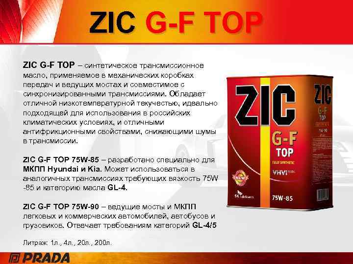 ZIC G-F TOP – синтетическое трансмиссионное масло, применяемое в механических коробках передач и ведущих мостах и совместимое с синхронизированными трансмиссиями. Обладает отличной низкотемпературной текучестью, идеально подходящей для использования в российских климатических условиях, и отличными антифрикционными свойствами, снижающими шумы в трансмиссии. ZIC G-F TOP 75 W-85 – разработано специально для МКПП Hyundai и Kia. Может использоваться в аналогичных трансмиссиях требующих вязкость 75 W -85 и категорию масла GL-4. ZIC G-F TOP 75 W-90 – ведущие мосты и МКПП легковых и коммерческих автомобилей, автобусов и грузовиков. Отвечает требованиям категорий GL-4/5 Литраж: 1 л. , 4 л. , 200 л.