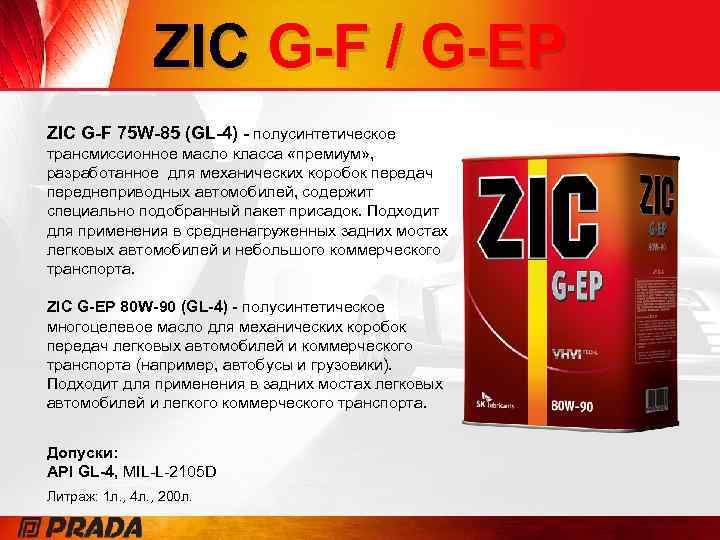 ZIC G-F / G-EP ZIC G-F 75 W-85 (GL-4) - полусинтетическое трансмиссионное масло класса «премиум» , разработанное для механических коробок передач переднеприводных автомобилей, содержит специально подобранный пакет присадок. Подходит для применения в средненагруженных задних мостах легковых автомобилей и небольшого коммерческого транспорта. ZIC G-EP 80 W-90 (GL-4) - полусинтетическое многоцелевое масло для механических коробок передач легковых автомобилей и коммерческого транспорта (например, автобусы и грузовики). Подходит для применения в задних мостах легковых автомобилей и легкого коммерческого транспорта. Допуски: API GL-4, MIL-L-2105 D Литраж: 1 л. , 4 л. , 200 л.