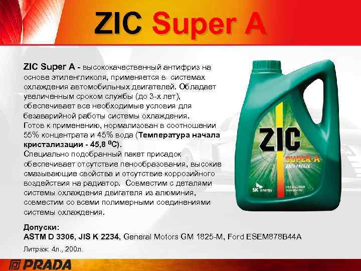ZIC Super A - высококачественный антифриз на основе этиленгликоля, применяется в системах охлаждения автомобильных двигателей. Обладает увеличенным сроком службы (до 3 -х лет), обеспечивает все необходимые условия для безаварийной работы системы охлаждения. Готов к применению, нормализован в соотношении 55% концентрата и 45% вода (Температура начала кристализации - 45, 8 0 С). Специально подобранный пакет присадок обеспечивает отсутствие пенообразования, высокие смазывающие свойства и отсутствие коррозийного воздействия на радиатор. Совместим с деталями системы охлаждения двигателя из алюминия, совместим со всеми полимерными соединениями системы охлаждения. Допуски: ASTM D 3306, JIS K 2234, General Motors GM 1825 -M, Ford ESEM 878 B 44 A Литраж: 4 л. , 200 л.