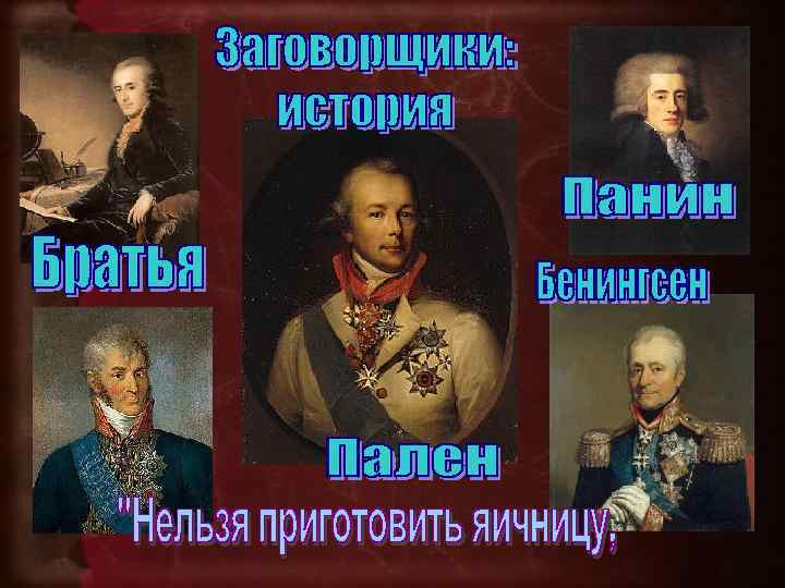 • «Как только известие о кончине императора распространилось в городе, немедленно же появились прически a la Titus, исчезли косы, обрезались букли и панталоны; круглые шляпы и сапоги с отворотами наполнили улицы» . «Лишь только рассвело, как улицы наполнились народом. Знакомые и незнакомые обнимались между собой и поздравляли друга с счастием — и общим, и частным для каждого порознь» . «Незнакомые целовались друг с другом как в Пасху, да и действительно это было воскресение всей России к новой жизни» . Однако велико было и количество людей, испытывавших омерзение к произошедшему. • Официальной версией смерти Павла был апоплексический удар (инсульт). Поэтому ходила шутка о том, что он скончался от апоплексического удара табакеркой в висок.