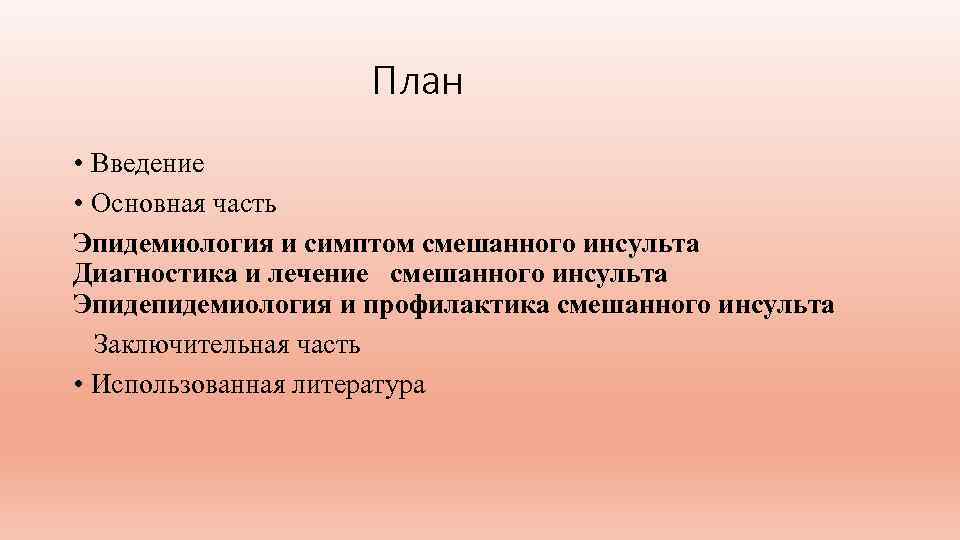 План • Введение • Основная часть Эпидемиология и симптом смешанного инсульта Диагностика и лечение смешанного инсульта Эпидемиология и профилактика смешанного инсульта Заключительная часть • Использованная литература
