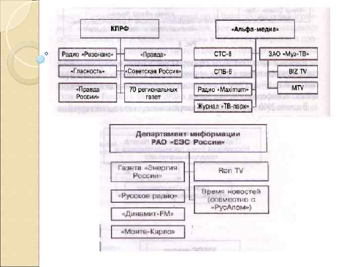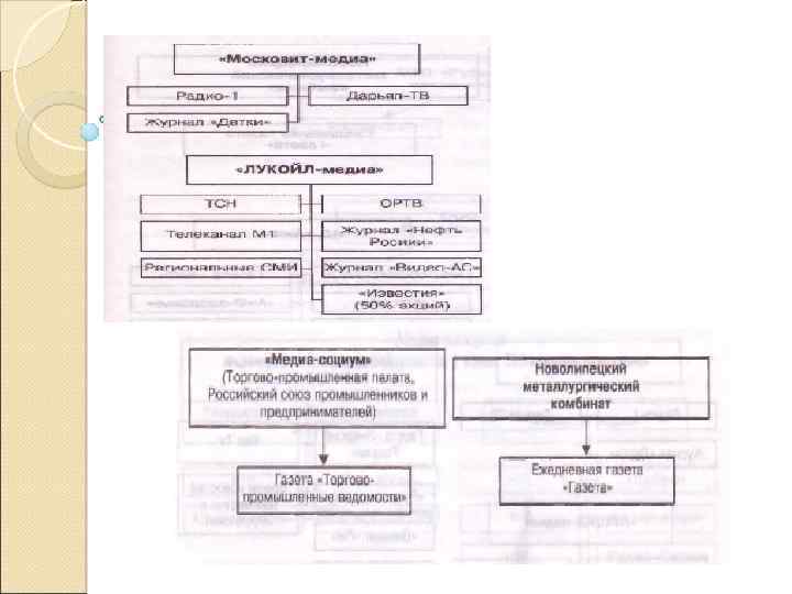 Уровни системы СМИ Первый и важнейший уровень состоит из электронных и печатных СМИ, формирующих единое российское информационное пространство. Первый уровень — СМИ контролируются политизированным капиталом или находятся в собственности государства
