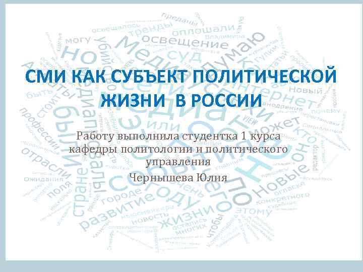 СМИ КАК СУБЪЕКТ ПОЛИТИЧЕСКОЙ ЖИЗНИ В РОССИИ Работу выполнила студентка 1 курса кафедры политологии и политического управления Чернышева Юлия