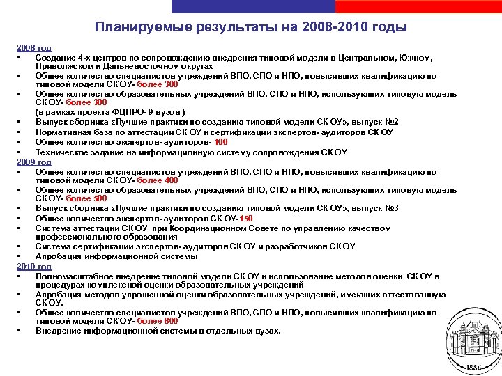 Планируемые результаты на 2008 -2010 годы 2008 год • Создание 4 -х центров по сопровождению внедрения типовой модели в Центральном, Южном, Приволжском и Дальневосточном округах • Общее количество специалистов учреждений ВПО, СПО и НПО, повысивших квалификацию по типовой модели СК ОУ- более 300 • Общее количество образовательных учреждений ВПО, СПО и НПО, использующих типовую модель СК ОУ- более 300 (в рамках проекта ФЦПРО- 9 вузов ) • Выпуск сборника «Лучшие практики по созданию типовой модели СК ОУ» , выпуск № 2 • Нормативная база по аттестации СК ОУ и сертификации экспертов- аудиторов СК ОУ • Общее количество экспертов- аудиторов- 100 • Техническое задание на информационную систему сопровождения СК ОУ 2009 год • Общее количество специалистов учреждений ВПО, СПО и НПО, повысивших квалификацию по типовой модели СК ОУ- более 400 • Общее количество образовательных учреждений ВПО, СПО и НПО, использующих типовую модель СК ОУ- более 500 • Выпуск сборника «Лучшие практики по созданию типовой модели СК ОУ» , выпуск № 3 • Общее количество экспертов- аудиторов СК ОУ-150 • Система аттестации СК ОУ при Координационном Совете по управлению качеством профессионального образования • Система сертификации экспертов- аудиторов СК ОУ и разработчиков СК ОУ • Апробация информационной системы 2010 год • Полномасштабное внедрение типовой модели СК ОУ и использование методов оценки СК ОУ в процедурах комплексной оценки образовательных учреждений • Апробация методов упрощенной оценки образовательных учреждений, имеющих аттестованную СК ОУ. • Общее количество специалистов учреждений ВПО, СПО и НПО, повысивших квалификацию по типовой модели СК ОУ- более 800 • Внедрение информационной системы в отдельных вузах. Санкт-Петербургский государственный электротехнический университет «ЛЭТИ»