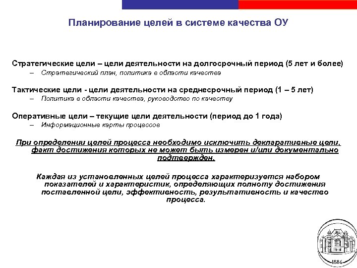 Планирование целей в системе качества ОУ Стратегические цели – цели деятельности на долгосрочный период (5 лет и более) – Стратегический план, политика в области качества Тактические цели - цели деятельности на среднесрочный период (1 – 5 лет) – Политика в области качества, руководство по качеству Оперативные цели – текущие цели деятельности (период до 1 года) – Информационные карты процессов При определении целей процесса необходимо исключить декларативные цели, факт достижения которых не может быть измерен и/или документально подтвержден. Каждая из установленных целей процесса характеризуется набором показателей и характеристик, определяющих полноту достижения поставленной цели, эффективность, результативность и качество процесса. Санкт-Петербургский государственный электротехнический университет «ЛЭТИ»