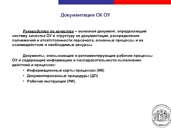 Документация СК ОУ Руководство по качеству – основной документ, определяющий систему качества ОУ и структуру ее документации, распределение полномочий и ответственности персонала, основные процессы и их взаимодействие и необходимые ресурсы. Документы, описывающие и регламентирующие рабочие процессы ОУ и содержащие информацию о последовательности выполнения действий и процессов: • Информационные карты процессов (ИК) • Документированные процедуры (ДП) • Рабочие инструкции (РИ). Санкт-Петербургский государственный электротехнический университет «ЛЭТИ»