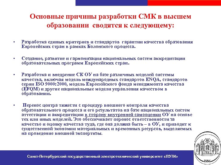 Основные причины разработки СМК в высшем образовании сводятся к следующему: • Разработка единых критериев и стандартов гарантии качества образования Европейских стран в рамках Болонского процесса. • Создание, развитие и гармонизация национальных систем аккредитации образовательных программ Европейских стран. • Разработка и внедрение СК ОУ на базе различных моделей системы качества, включая модель международных стандартов ENQA, стандартов серии ISO 9000: 2000, модель Европейского фонда менеджмента качества (EFQM) и другие национальные модели управления качеством в образовании. • Перенос центра тяжести с процедур внешнего контроля качества образовательного процесса и его результатов на базе национальных систем аттестации и аккредитации в сторону внутренней самооценки ОУ на основе тех или иных моделей. Это обеспечивает перенос ответственности за качество и оценку качества туда, где она должна быть – в ОУ, и приводит к существенной экономии материальных и временных ресурсов, выделяемых на проведение внешней экспертизы. Санкт-Петербургский государственный электротехнический университет «ЛЭТИ»