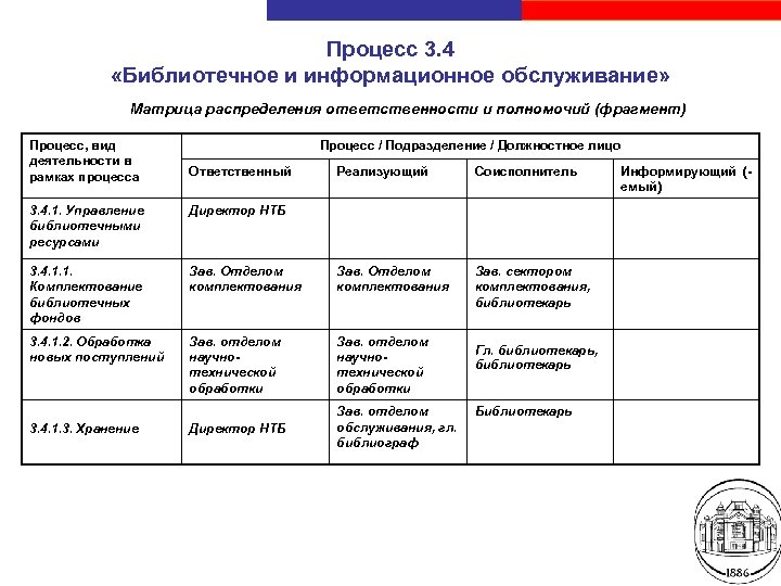 Процесс 3. 4 «Библиотечное и информационное обслуживание» Матрица распределения ответственности и полномочий (фрагмент) Процесс, вид деятельности в рамках процесса Процесс / Подразделение / Должностное лицо Ответственный Реализующий Соисполнитель Зав. сектором комплектования, библиотекарь 3. 4. 1. Управление библиотечными ресурсами Директор НТБ 3. 4. 1. 1. Комплектование библиотечных фондов Зав. Отделом комплектования 3. 4. 1. 2. Обработка новых поступлений Зав. отделом научнотехнической обработки Директор НТБ Зав. отделом обслуживания, гл. библиограф Информирующий (емый) 3. 4. 1. 3. Хранение Гл. библиотекарь, библиотекарь Библиотекарь Санкт-Петербургский государственный электротехнический университет «ЛЭТИ»
