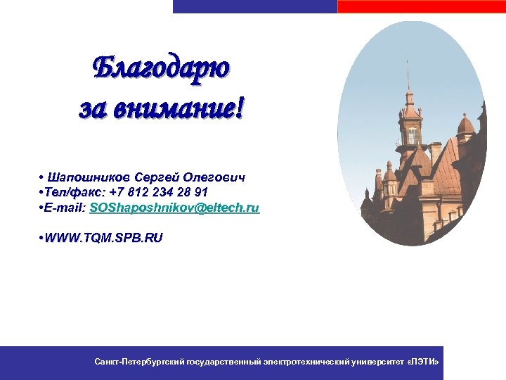 Благодарю за внимание! • Шапошников Сергей Олегович • Тел/факс: +7 812 234 28 91 • E-mail: SOShaposhnikov@eltech. ru • WWW. TQM. SPB. RU Санкт-Петербургский государственный электротехнический университет «ЛЭТИ»