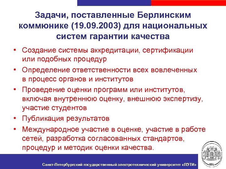 Задачи, поставленные Берлинским коммюнике (19. 09. 2003) для национальных систем гарантии качества • Создание системы аккредитации, сертификации или подобных процедур • Определение ответственности всех вовлеченных в процесс органов и институтов • Проведение оценки программ или институтов, включая внутреннюю оценку, внешнюю экспертизу, участие студентов • Публикация результатов • Международное участие в оценке, участие в работе сетей, разработка согласованных стандартов, процедур и методик оценки качества. Санкт-Петербургский государственный электротехнический университет «ЛЭТИ»