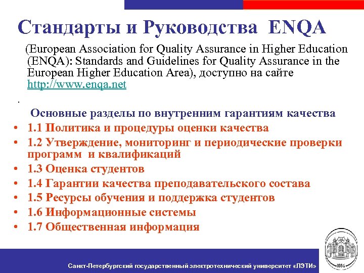 Стандарты и Руководства ENQA (European Association for Quality Assurance in Higher Education (ENQA): Standards and Guidelines for Quality Assurance in the European Higher Education Area), доступно на сайте http: //www. enqa. net. • • Основные разделы по внутренним гарантиям качества 1. 1 Политика и процедуры оценки качества 1. 2 Утверждение, мониторинг и периодические проверки программ и квалификаций 1. 3 Оценка студентов 1. 4 Гарантии качества преподавательского состава 1. 5 Ресурсы обучения и поддержка студентов 1. 6 Информационные системы 1. 7 Общественная информация Санкт-Петербургский государственный электротехнический университет «ЛЭТИ»
