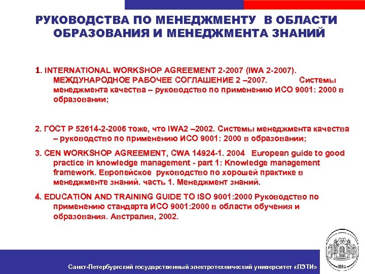 РУКОВОДСТВА ПО МЕНЕДЖМЕНТУ В ОБЛАСТИ ОБРАЗОВАНИЯ И МЕНЕДЖМЕНТА ЗНАНИЙ 1. INTERNATIONAL WORKSHOP AGREEMENT 2 -2007 (IWA 2 -2007). МЕЖДУНАРОДНОЕ РАБОЧЕЕ СОГЛАШЕНИЕ 2 – 2007. Cистемы менеджмента качества – руководство по применению ИСО 9001: 2000 в образовании; 2. ГОСТ Р 52614 -2 -2006 тоже, что IWA 2 – 2002. Cистемы менеджмента качества – руководство по применению ИСО 9001: 2000 в образовании; 3. CEN WORKSHOP AGREEMENT, CWA 14924 -1. 2004 European guide to good practice in knowledge management - part 1: Knowledge management framework. Европейское руководство по хорошей практике в менеджменте знаний. часть 1. Менеджмент знаний. 4. EDUCATION AND TRAINING GUIDE TO ISO 9001: 2000 Руководство по применению стандарта ИСО 9001: 2000 в области обучения и образования. Австралия, 2002. Санкт-Петербургский государственный электротехнический университет «ЛЭТИ» 5