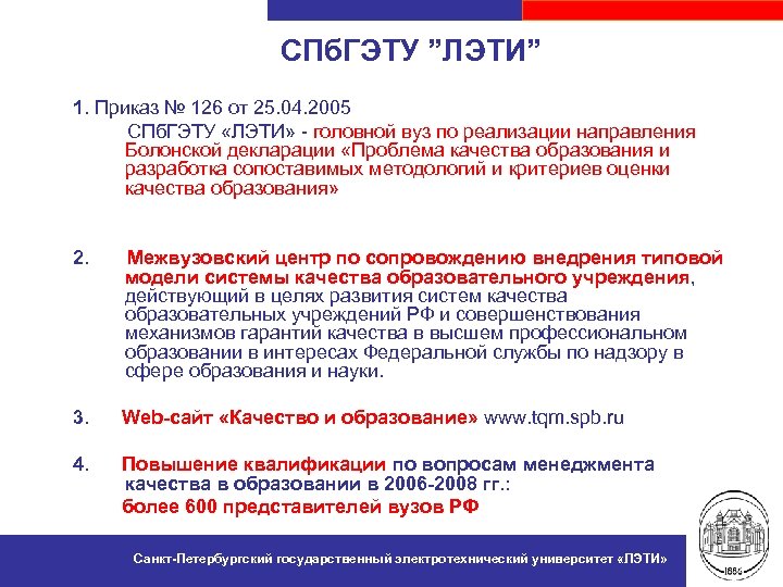 СПб. ГЭТУ ”ЛЭТИ” 1. Приказ № 126 от 25. 04. 2005 СПб. ГЭТУ «ЛЭТИ» - головной вуз по реализации направления Болонской декларации «Проблема качества образования и разработка сопоставимых методологий и критериев оценки качества образования» 2. Межвузовский центр по сопровождению внедрения типовой модели системы качества образовательного учреждения, действующий в целях развития систем качества образовательных учреждений РФ и совершенствования механизмов гарантий качества в высшем профессиональном образовании в интересах Федеральной службы по надзору в сфере образования и науки. 3. Web-сайт «Качество и образование» www. tqm. spb. ru 4. Повышение квалификации по вопросам менеджмента качества в образовании в 2006 -2008 гг. : более 600 представителей вузов РФ Санкт-Петербургский государственный электротехнический университет «ЛЭТИ»