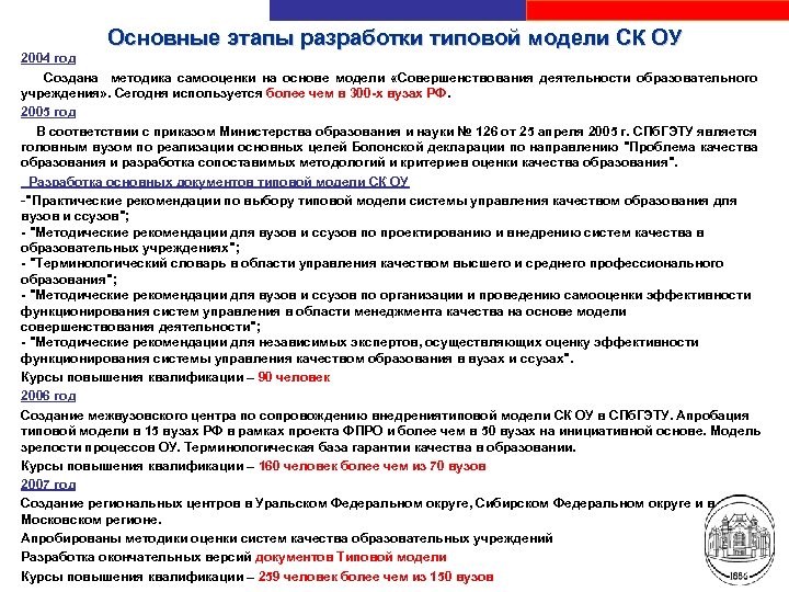Основные этапы разработки типовой модели СК ОУ 2004 год Создана методика самооценки на основе модели «Совершенствования деятельности образовательного учреждения» . Сегодня используется более чем в 300 -х вузах РФ. 2005 год В соответствии с приказом Министерства образования и науки № 126 от 25 апреля 2005 г. СПб. ГЭТУ является головным вузом по реализации основных целей Болонской декларации по направлению "Проблема качества образования и разработка сопоставимых методологий и критериев оценки качества образования". Разработка основных документов типовой модели СК ОУ -"Практические рекомендации по выбору типовой модели системы управления качеством образования для вузов и ссузов"; - "Методические рекомендации для вузов и ссузов по проектированию и внедрению систем качества в образовательных учреждениях"; - "Терминологический словарь в области управления качеством высшего и среднего профессионального образования"; - "Методические рекомендации для вузов и ссузов по организации и проведению самооценки эффективности функционирования систем управления в области менеджмента качества на основе модели совершенствования деятельности"; - "Методические рекомендации для независимых экспертов, осуществляющих оценку эффективности функционирования системы управления качеством образования в вузах и ссузах". Курсы повышения квалификации – 90 человек 2006 год Создание межвузовского центра по сопровождению внедрениятиповой модели СК ОУ в СПб. ГЭТУ. Апробация типовой модели в 15 вузах РФ в рамках проекта ФПРО и более чем в 50 вузах на инициативной основе. Модель зрелости процессов ОУ. Терминологическая база гарантии качества в образовании. Курсы повышения квалификации – 160 человек более чем из 70 вузов 2007 год Создание региональных центров в Уральском Федеральном округе, Сибирском Федеральном округе и в Московском регионе. Апробированы методики оценки систем качества образовательных учреждений Разработка Санкт-Петербургский государственный электротехнический университет «ЛЭТИ» окончательных версий документов Типовой модели Курсы повышения квалификации – 259 человек более чем из 150 вузов