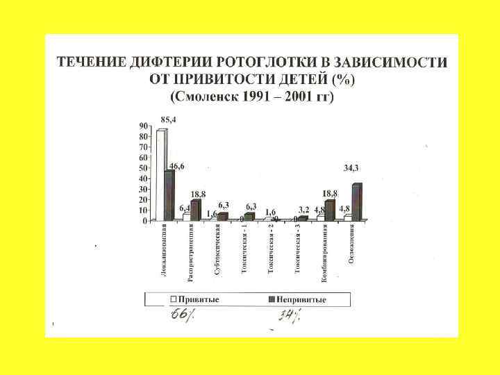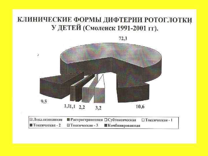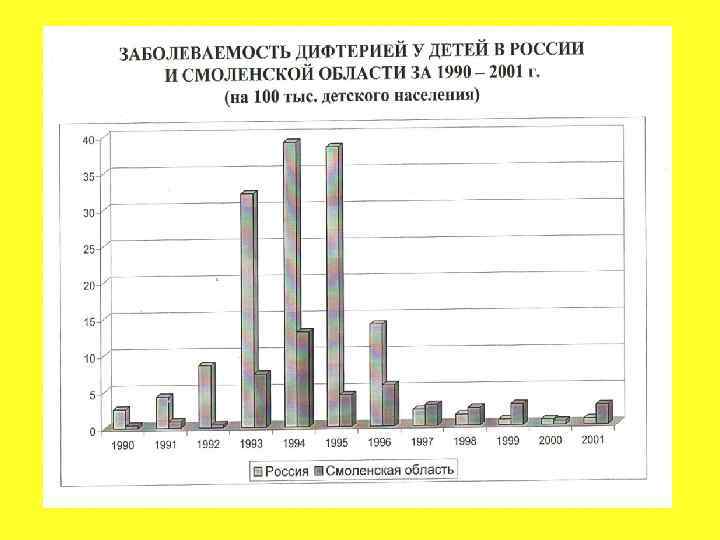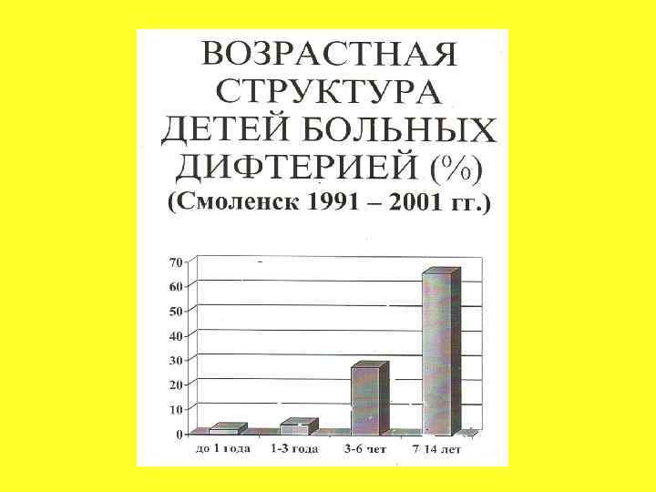 КЛИНИКО-ЭПИДЕМИОЛОГИЧЕСКИЕ ОСОБЕННОСТИ ДИФТЕРИИ У НЕ ПРИВИТЫХ ДЕТЕЙ (Смоленск 1991 - 2001 гг. ) • Преобладали дети до 7 лет (86%); • Выявлено 3 вспышки заболевания (Гагарин, Рославль, Смоленск); • Клиника заболевания имела типичную классическую картину; • Токсические формы отмечены в 5 раз чаще, чем у привитых; • Комбинированные формы (дифтерия ротоглотки + дифтерия носа) встречались в 4, 5 раза чаще; • Осложнения развились у 34, 3% больных детей, преимущественно при токсических и комбинированных формах; • 1 не привитой ребенок умер в возрасте 1 г. 9 мес.