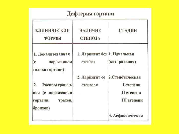 КЛИНИЧЕСКИЕ ФОРМЫ ДИФТЕРИИ У ДЕТЕЙ В ЗАВИСИМОСТИ ОТ ЛОКАЛИЗАЦИИ ПРОЦЕССА (литературные данные) 1. Дифтерия ротоглотки; 2. Дифтерия носа; 3. Комбинированные формы: а) дифтерия ротоглотки + дифтерия носа; б) дифтерия ротоглотки + дифтерия гортани; 4. Дифтерия гортани; 5. Другие редкие формы: дифтерия кожи, глаз и т. д.