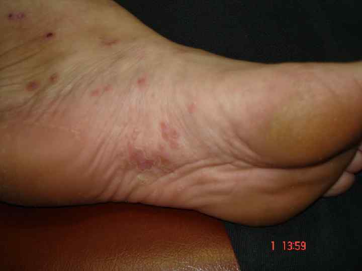 • имеется склонность к скученному расположению высыпаний, • группировка с образованием дуг, гирлянд, линий, иногда образуются бляшки; • расположение сыпи симметричное; • локализация — сгибательные поверхности конечностей, туловище, слизистые; • возможно зостериформное расположение; • субъективно—зуд различной интенсивности вплоть до нестерпимого; • возможно поражение ногтевых пластинок.