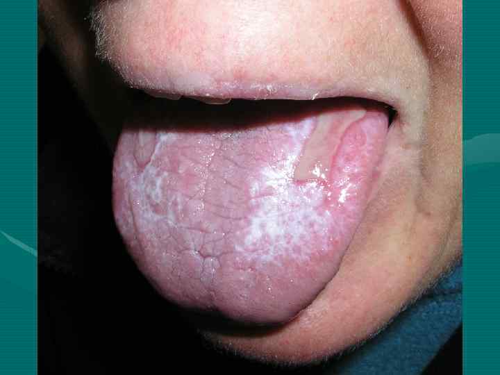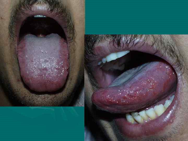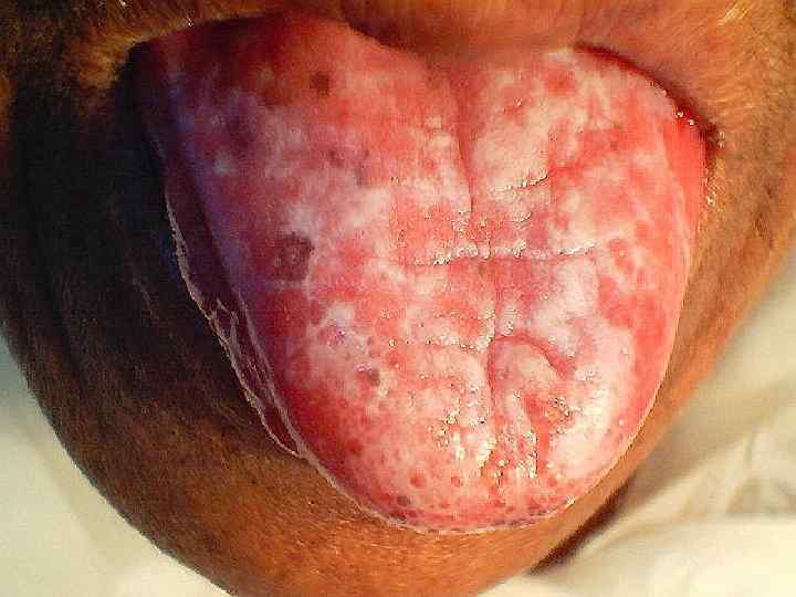 На языке папулы имеют вид бляшек до 1 см и диаметре, напоминая лейкоплакию, с серовато-белым, не снимающимся налетом на поверхности.