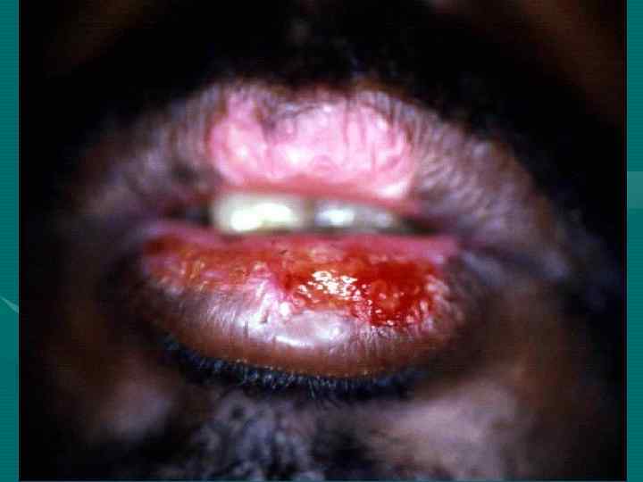 На красной кайме губ папулы имеют либо звёздчатую форму, либо сливаются в виде сплошной шелушащейся полосы;