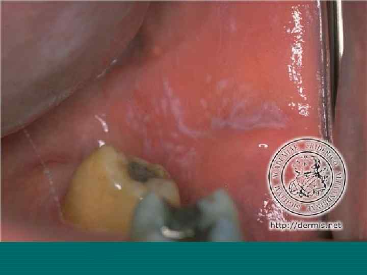 Типичные очаги поражения КПЛ на слизистых полости рта наблюдаются билатерально, в области щек в проекции моляров, на деснах, на спинке языка, реже на красной кайме губ и других участках. Патологический процесс проявляется в виде: • кружева • белых полосок • кератотических колец
