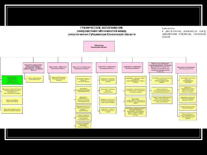 n n n Заместитель Губернатора Смоленской области Ольга Окунева координирует и контролирует деятельность: - Департамента Смоленской области по социальному развитию; - Департамента Смоленской области по здравоохранению; - Департамента Смоленской области по образованию, науке и делам молодежи; - Департамента Смоленской области по культуре и туризму. Заместитель Губернатора Смоленской области Николай Кузнецов координирует и контролирует деятельность: - Департамента Смоленской области по информационным технологиям; - Департамента государственной службы занятости населения Смоленской области; - Департамента Смоленской области по природным ресурсам и экологии; - Главного управления спорта Смоленской области; - Главного управления записи актов гражданского состояния Смоленской области.