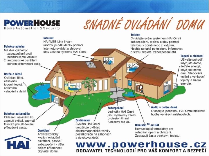 Inteligentní a bezpečná domácnost Nyní můžete s pomocí technologií HAI Omni a X-10 zabezpečit a automatizovat všechny činnosti v domě jako: § § § § § osvětlení závěsy, rolety, žaluzie domácí kino, TV, SAT, Hi. Fi, aj. A/V techniku vytápění a klimatizaci kamerový systém domovní telefon garážová vrata a brány zavlažování a jiné…….