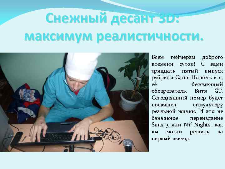 Снежный десант 3 D: максимум реалистичности. Всем геймерам доброго времени суток! С вами тридцать пятый выпуск рубрики Game Hunterz и я, её бессменный обозреватель, Витя GT. Сегодняшний номер будет посвящен симулятору реальной жизни. И это не банальное переиздание Sims 3 или NY Nights, как вы могли решить на первый взгляд.