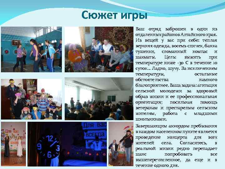 Сюжет игры Ваш отряд заброшен в один из отдаленных районов Алтайского края. Из вещей у вас при себе: теплая верхняя одежда, восемь спичек, банка тушенки, сломанный компас и шахматы. Цель: выжить при температуре ниже -30 С в течение 10 суток… Ладно, шучу. За исключением температуры, остальные обстоятельства намного благоприятнее. Ваша задача: агитация сельской молодежи за здоровый образ жизни и ее профессиональная ориентация; посильная помощь ветеранам и престарелым сельским жителям, работа с младшими школьниками. Завершающим аккордом пребывания в каждом населенном пункте является проведение концерта для всех жителей села. Согласитесь, в реальной жизни редко перепадает шанс попробовать все вышеперечисленное, да еще и в течение одного дня.