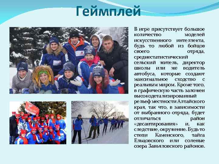 Геймплей В игре присутствует большое количество моделей искусственного интеллекта, будь то любой из бойцов своего отряда, среднестатистический сельский житель, директор школы или же водитель автобуса, которые создают максимальное сходство с реальным миром. Кроме того, в графическую часть заложен высокодетализированный рельеф местности Алтайского края, так что, в зависимости от выбранного отряда, будет отличаться район «десантирования» и, как следствие, окружение. Будь то степи Каменского, тайга Ельцовского или соленые озера Завьяловского районов.