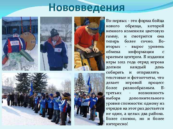 Нововведения Во-первых - это форма бойца нового образца, которой немного изменили цветовую гамму, и смотрится она теперь более сочно. Вовторых - вырос уровень обмена информации с краевым центром. В издании игры 2012 года отряд игрока должен каждый день собирать и отправлять текстовые и фотоотчеты, что делает игровой процесс более разнообразным. Втретьих возможность выбора дополнительного уровня сложности: одному из отрядов на этот раз достается не один, а целых два района. Более сложно, но и более интересно!