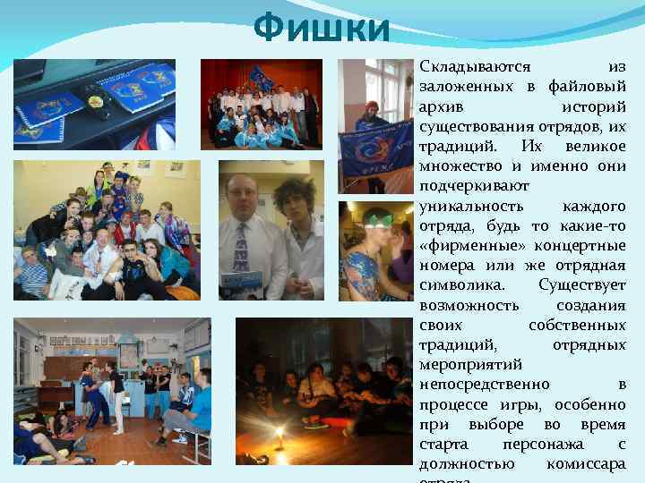 Фишки Складываются из заложенных в файловый архив историй существования отрядов, их традиций. Их великое множество и именно они подчеркивают уникальность каждого отряда, будь то какие-то «фирменные» концертные номера или же отрядная символика. Существует возможность создания своих собственных традиций, отрядных мероприятий непосредственно в процессе игры, особенно при выборе во время старта персонажа с должностью комиссара