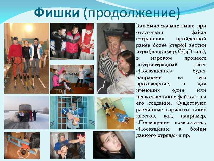 Фишки (продолжение) Как было сказано выше, при отсутствии файла сохранения пройденной ранее более старой версии игры (например, СД 3 D-2011), в игровом процессе внутриотрядный квест «Посвящение» будет направлен на его прохождение, а для имеющих один или несколько таких файлов – на его создание. Существуют различные варианты таких квестов, как, например, «Посвящение комсостава» , «Посвящение в бойцы данного отряда» и пр.