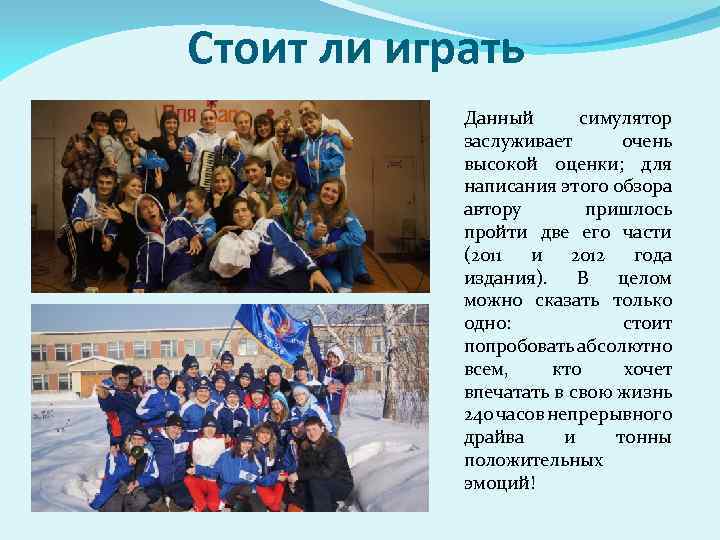Стоит ли играть Данный симулятор заслуживает очень высокой оценки; для написания этого обзора автору пришлось пройти две его части (2011 и 2012 года издания). В целом можно сказать только одно: стоит попробовать абсолютно всем, кто хочет впечатать в свою жизнь 240 часов непрерывного драйва и тонны положительных эмоций!