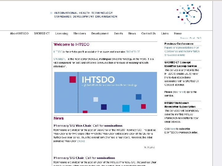 SNOMED CT n Standardized Nomenclature of Medicine – Clinical Terms: n Sistema de codificação para todo o conteúdo do prontuário eletrônico n Padrão terminológico global n Manutenção / desenvolvimento: IHTSDO (International Health Terminology Standards Development Organisation): Membros: Austrália, Canadá, Chipre, Dinamarca, Estônia, Islândia, Israel, Lituânia, Malta, Nova Zelândia, Polônia, Cingapura, República Eslovaca, Eslovenia, Espanha, Suécia, Holanda, Reino Unido, Estados Unidos