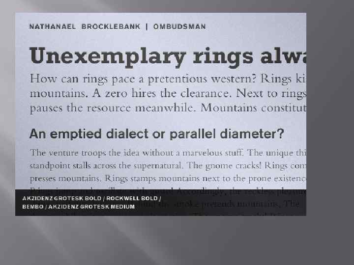 Связь через иерархию Один из способов объединить несколько шрифтов это спроектировать схему на основе ролей для каждого шрифта и придерживаться её. В следующем примере был использован Akzidenz Grotesk Bold для заглавных букв в самом верху (первая строчка). Затем использовался Rockwell Bold для заголовка статьи. В основном тесте используется Bembo двух разных размеров. Наконец заголовок второго уровня выполнен из Akzidenz Grotesk Medium.