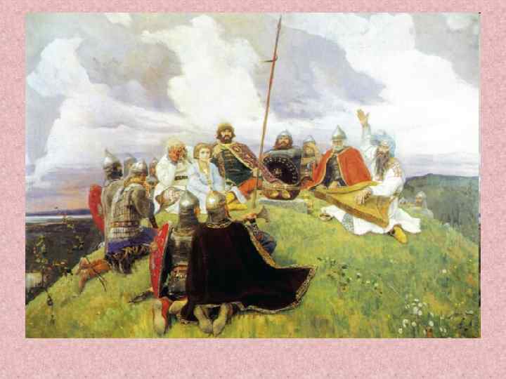 • 4. Фон картины: описание неба, земли. Цвет плащей дружинников и одежды певца. Какие тона преобладают в картине? • 5. Какому периоду в истории нашей Родины посвящена картина? В каком произведении древнерусской литературы упоминается Баян?