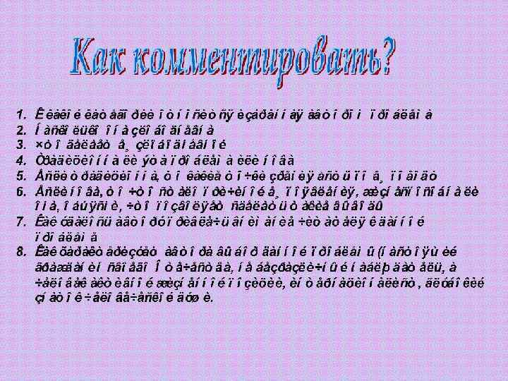 Комментарий может быть: контекстуальный и концептуальный. Комментируя текст необходимо опираться на него, использовать ключевые слова, цитаты, не допускать фактических ошибок, связанных с пониманием исходного текста.