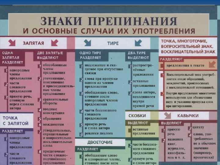 Всего в русской пунктуации 10 знаков препинания: Ø точка, Ø точка с запятой, Ø запятая, Ø двоеточие, Ø тире, Ø вопросительный знак, Ø восклицательный знак, Ø многоточие, Ø скобки, Ø кавычки.